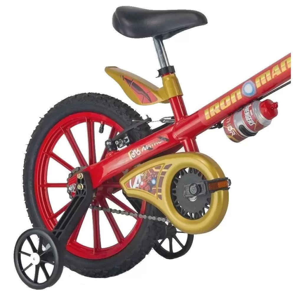 A bicicleta Iron Man Aro 16 da Nathor possui limitador de giro do guidão, importante característica que evita com que guidão dê uma volta completa e danifique o freio, além de preservar a integridade física da criança. Com freios V-Brake e maçaneta em Nylon, garante uma ótima rigidez, fazendo com que a frenagem seja mais eficiente por não sofrer deformação. Outro detalhe é que na hora que a criança quiser acionar o freio, a cor amarela fica em destaque para não ter dúvidas para apertar o freio traseiro, garantindo assim a sua segurança. A bike vem com pneus com câmara, quadro em aço carbono e garrafinha. Essa bicicleta faz a alegria dos meninos que querem diversão e aventura.